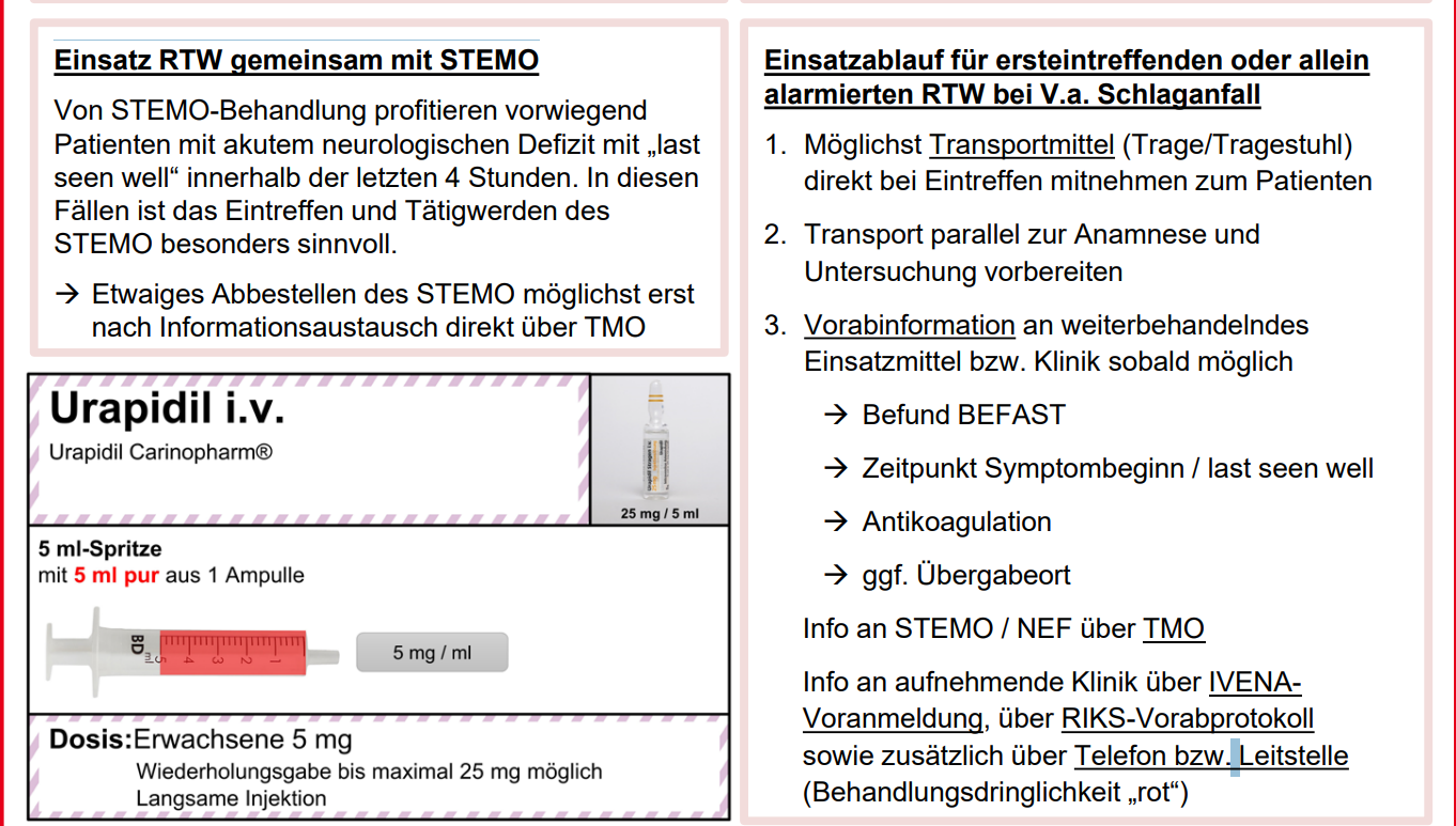 Einsatz RTW gemeinsam mit STEMO Von STEMO-Behandlung profitieren vorwiegend Patienten mit akutem neurologischen Defizit mit „last seen well“ innerhalb der letzten 4 Stunden. In diesen Fällen ist das Eintreffen und Tätigwerden des STEMO besonders sinnvoll. Etwaiges Abbestellen des STEMO möglichst erst nach Informationsaustausch direkt über TMO