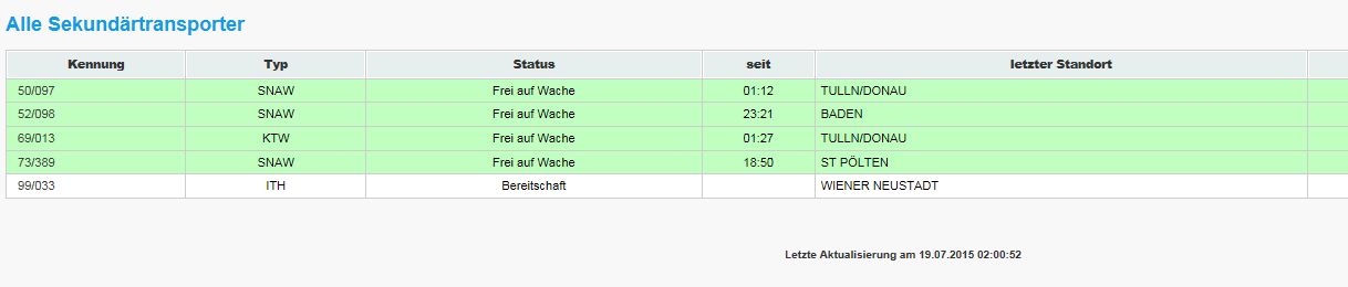 Alle Fzg. scheinen allerdings hier nur zusätzlich auf und sind primär bei ihrer „Heimtatdienststelle“ bzw. dort mit ihrem aktuellen Stützpunkt (aktuell SNAW vom ASB St.Georgen beim ASB St. Pölten, oder einer der Tullner SNAW auf der Dienststelle Grafenwörth oder auch beim RK St. Pölten,…) gelistet. Fix sind nur alle SNAW, da die quasi immer als überregionales Einsatzmittel gelten.
